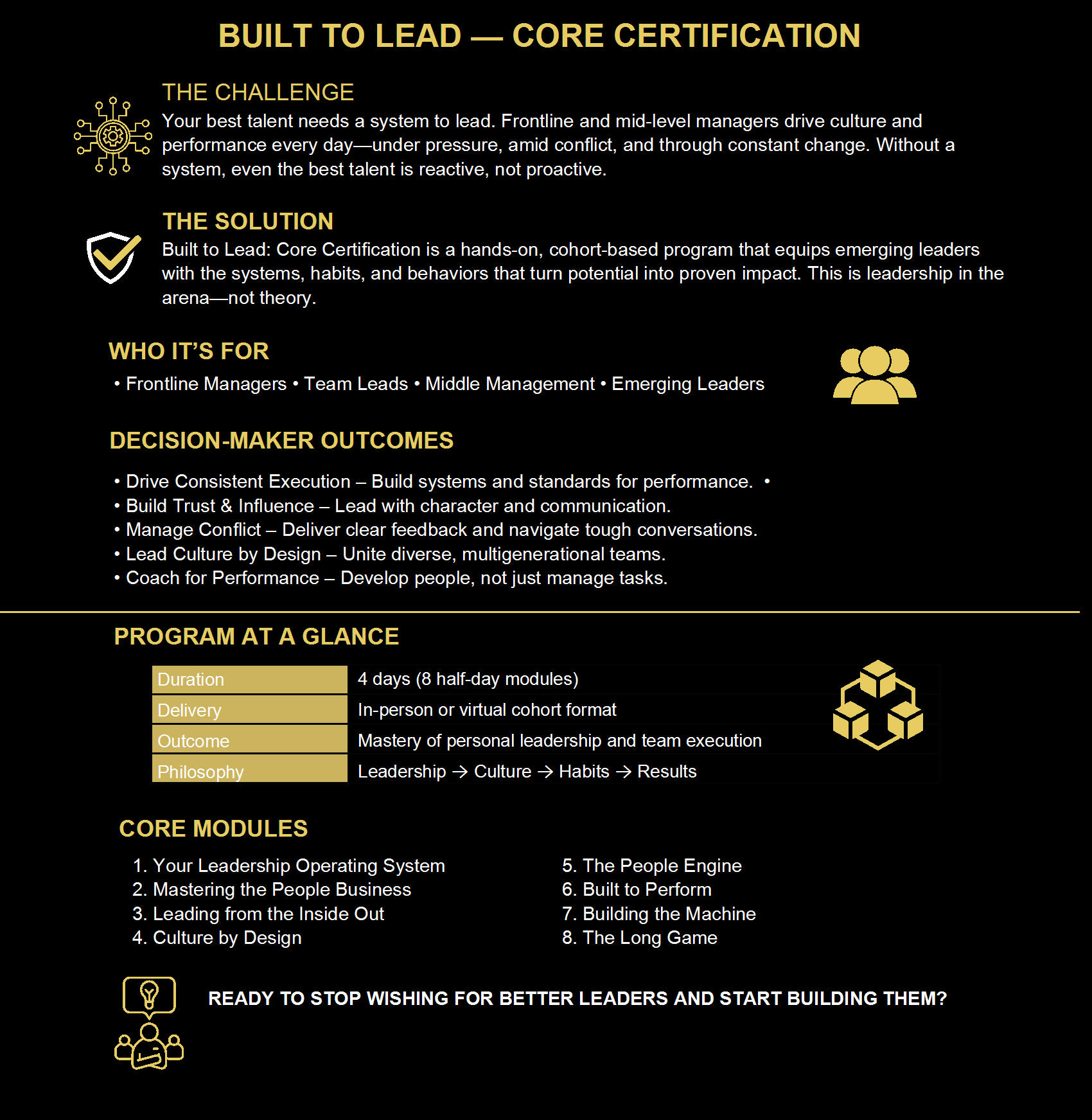Through focused leadership development and consulting, we help organizations move beyond talent and develop leaders who inspire trust, build cultures, and drive measurable results.